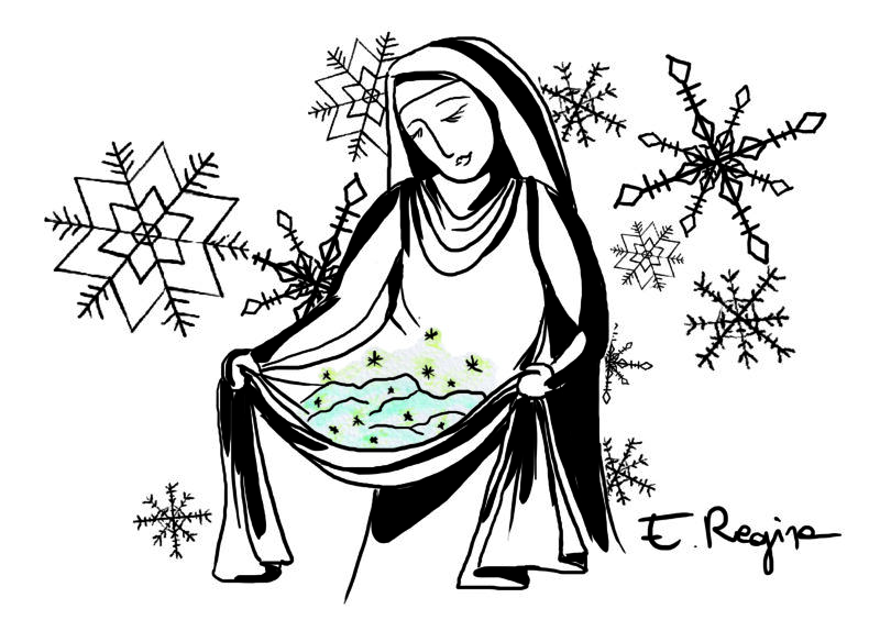 La Madre di Dio la scorse nel fondo, la chiamò e le chiese come si chiamava; «Madonnina della neve», rispose la giovane che reggeva un grembiule teso e gonfio: lo aprì, improvvisamente, liberando una miriade di fiocchi di neve trasformati in bianche corolle. Poi nella grotta si sprigionò un intenso profumo, che avvolse l’ambiente con grande meraviglia di tutte le altre Madonne…