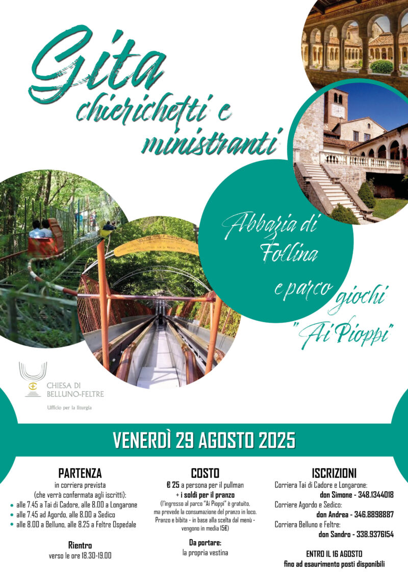 Venerdì 29 agosto, partendo con tre diversi pullman dalle varie zone della diocesi, chierichetti e ministranti si dirigeranno nella vicina diocesi di Vittorio-Veneto: prima tappa l’abbazia di Follina, dove vivere un momento di preghiera in un santuario giubilare; seconda tappa il parco giochi e osteria “Ai Pioppi”, dove a prevalere sarà il divertimento, la convivialità, lo stare insieme!