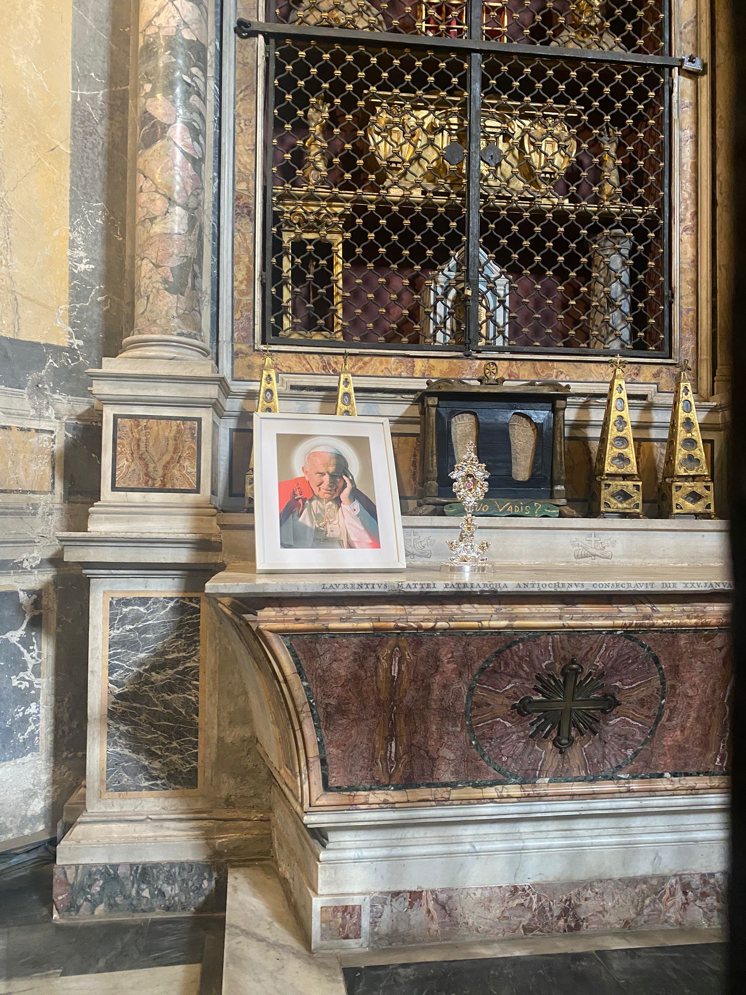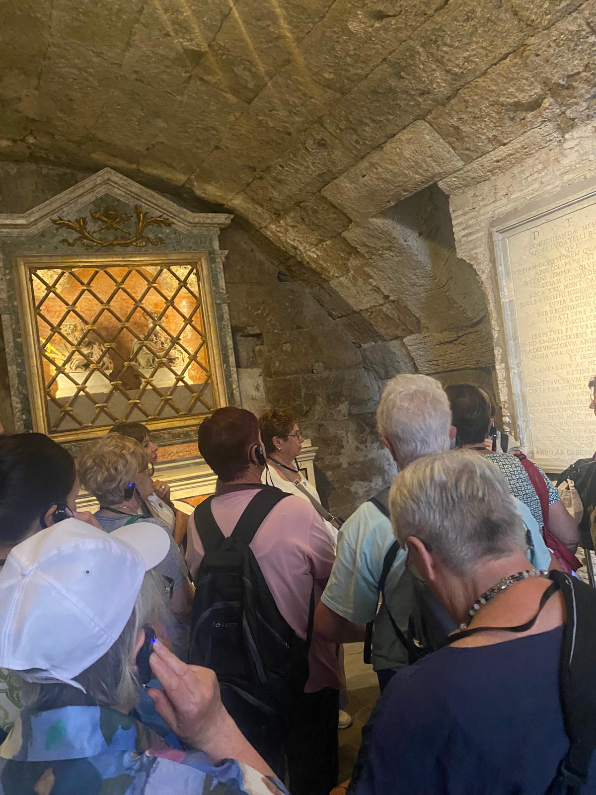 Durante la visita, ci è stato mostrato anche il luogo originario della sepoltura di San Sebastiano, situato esattamente tre metri sopra l’attuale tomba. Questo dettaglio archeologico ci ha permesso di comprendere ancora meglio la stratificazione storica e la profonda venerazione riservata fin dall’antichità a questo martire romano.