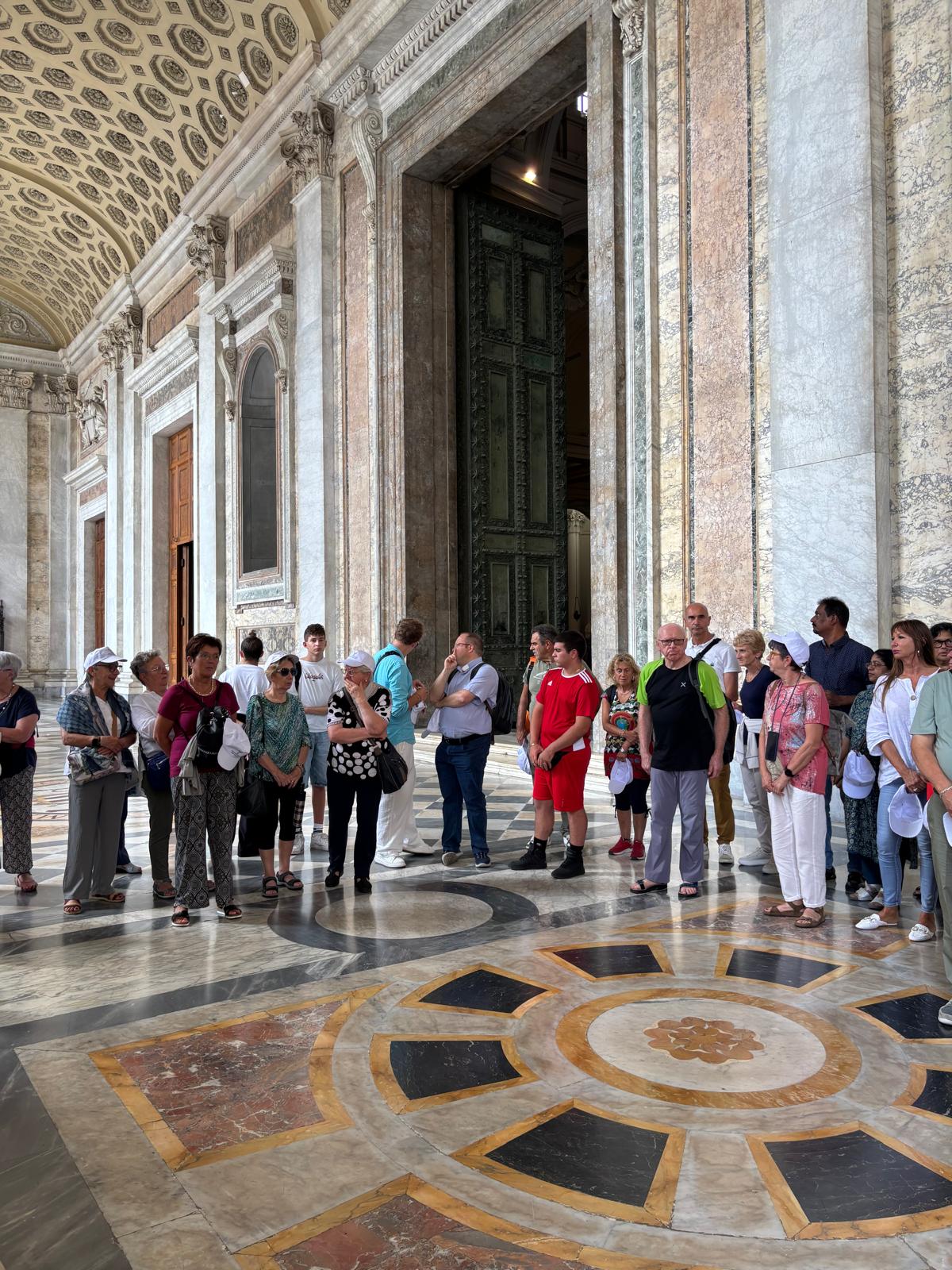 Arrivati davanti alla basilica, ancora con il cuore in ascolto, ci siamo raccolti in preghiera e canto prima di varcare la Porta Santa. È stato un momento intenso: insieme abbiamo meditato sull’importanza della pace, che è stato anche il primo messaggio lanciato da Papa Leone che ci ha esortati fin dal primo momento ad essere seminatori di pace. Ci siamo sentiti interpellati: la pace è una chiamata personale, ognuno di noi è chiamato a cercarla dentro di sé per poi portarla nel mondo. Alcuni hanno vissuto anche il dono del sacramento della Riconciliazione, grazie alla presenza dei nostri sacerdoti.