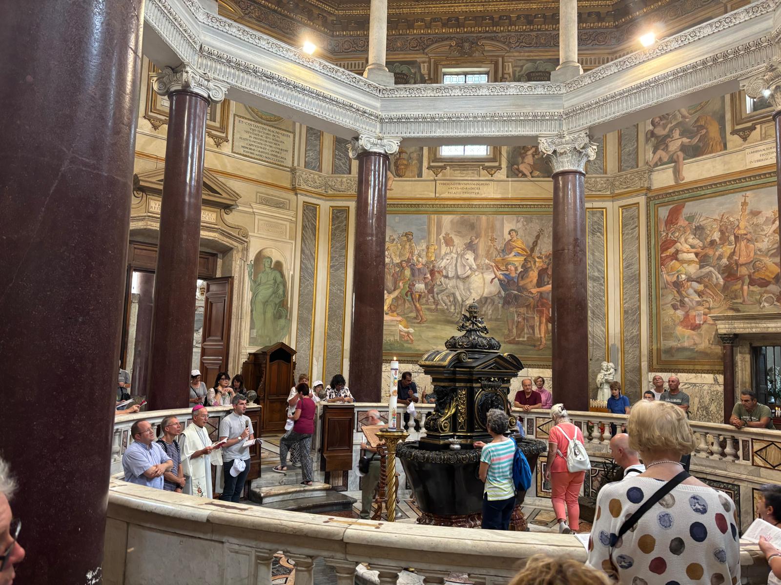 Poi, come comunità riunita, ci siamo spostati nel Battistero del Laterano, luogo ricco di storia e spiritualità, per rinnovare le promesse del nostro battesimo. È stato un momento semplice ma profondo: con l’aiuto dei nostri sacerdoti, abbiamo riflettuto sulla grandezza dell’amore di Dio, un amore in cui siamo chiamati a immergerci ogni giorno, lasciandoci inondare e trasformare dalla sua grazia. Uno alla volta, in fila, abbiamo attraversato la fonte battesimale scendendo e risalendo i suoi tre gradini, segno simbolico ma profondo che ha reso visibile il nostro desiderio di rinascere alla fede con cuore nuovo.