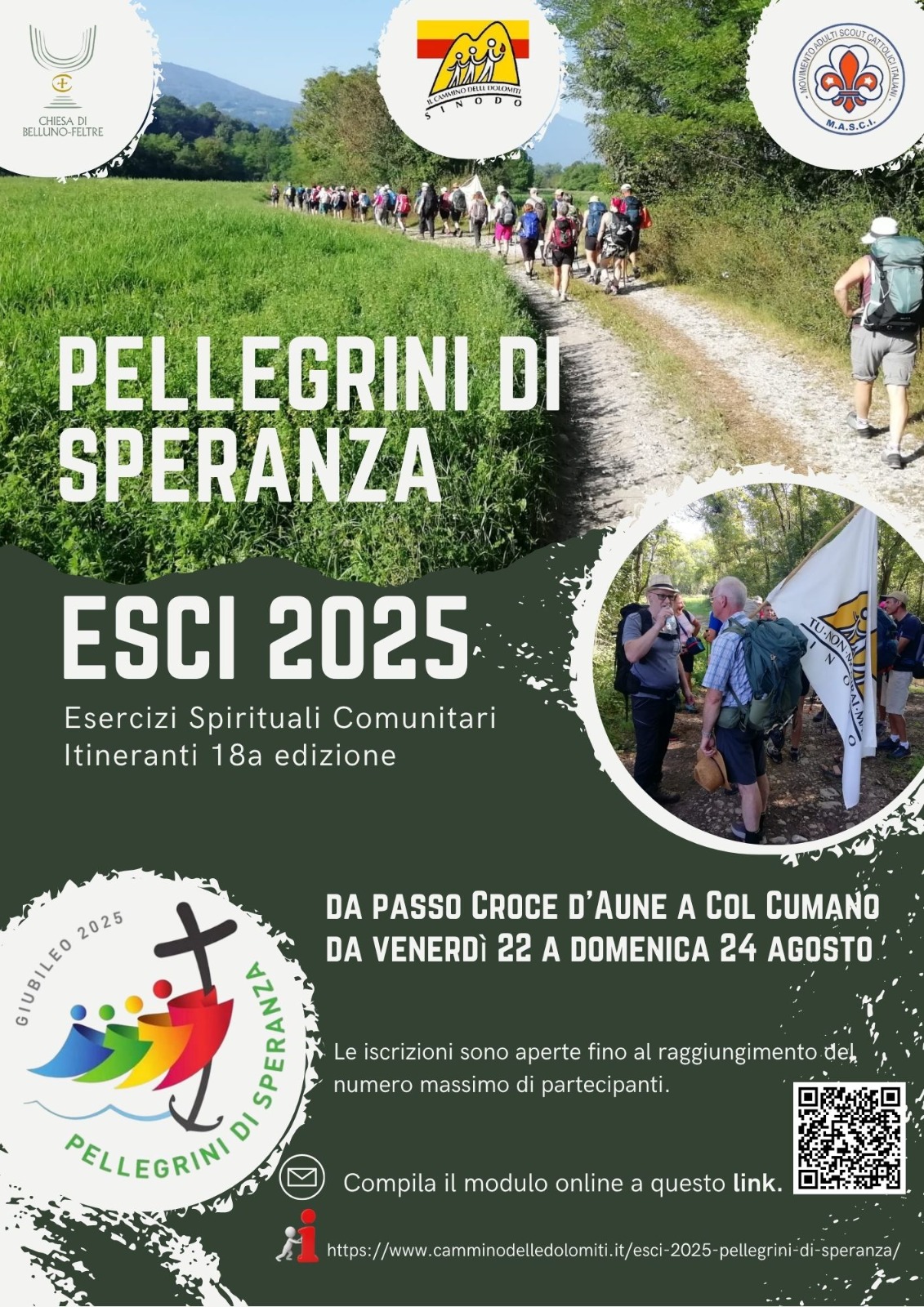 La realizzazione degli ESCI 2025 è resa possibile dall’impegno logistico-organizzativo della comunità “Le Dalmede” di adulti scout (MASCI) di Belluno-Feltre, con il patrocinio e il contributo dell’Ufficio diocesano di Pastorale sociale e del lavoro e il fondamentale sostegno delle comunità locali.