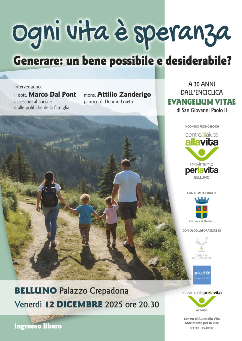 Con questo intento il Centro Aiuto alla Vita di Belluno, impegnato ad aiutare le madri più fragili e i loro bambini, in collaborazione con i Centri di Aiuto alla Vita della provincia, il Comitato provinciale Unicef, la Diocesi di Belluno Feltre e il Comune di Belluno propongono un momento di riflessione sui contenuti dell’Evangelium Vitae e sulla situazione demografica della provincia, al fine di contribuire a definire possibili percorsi per il presente e il futuro.