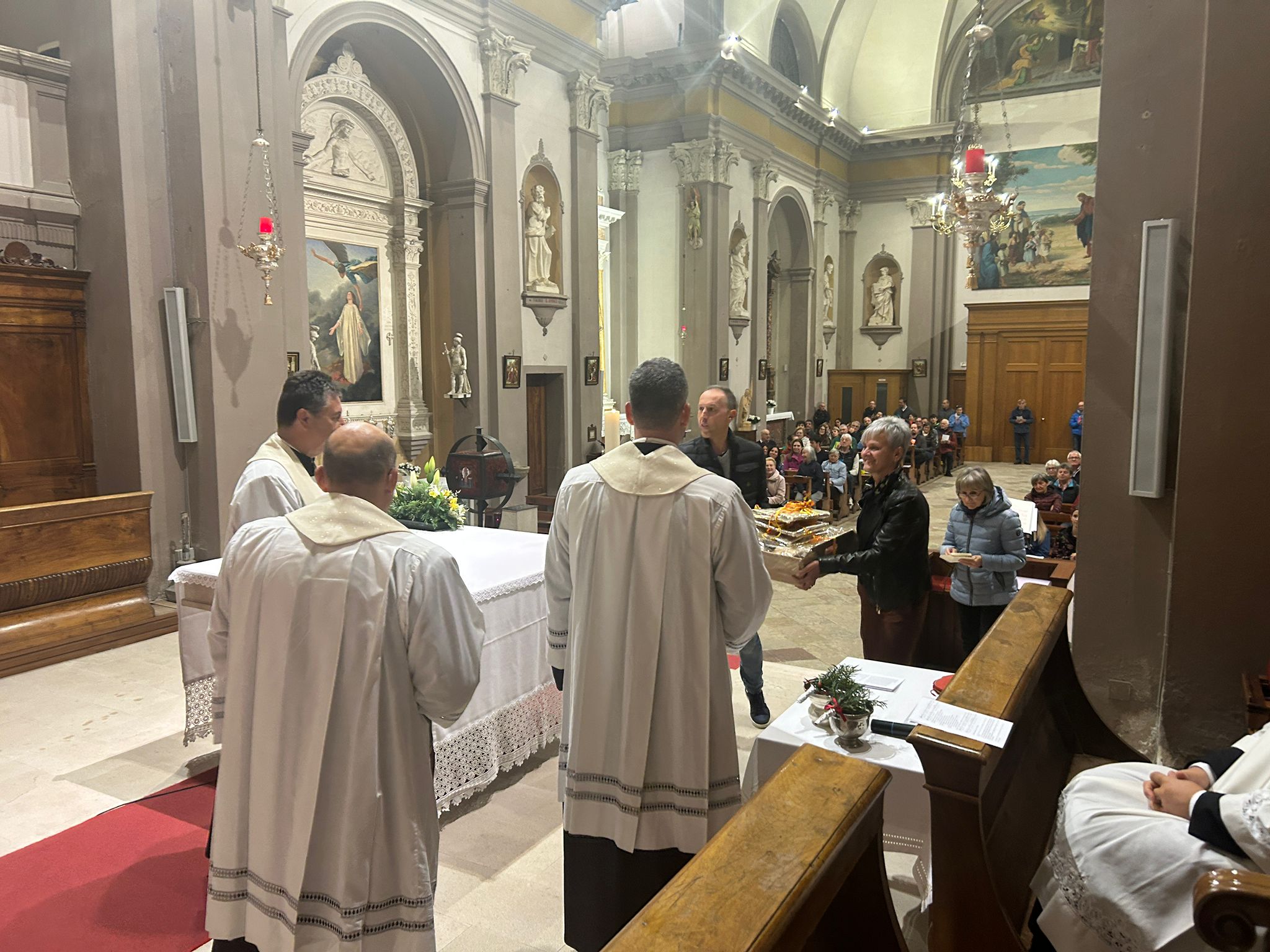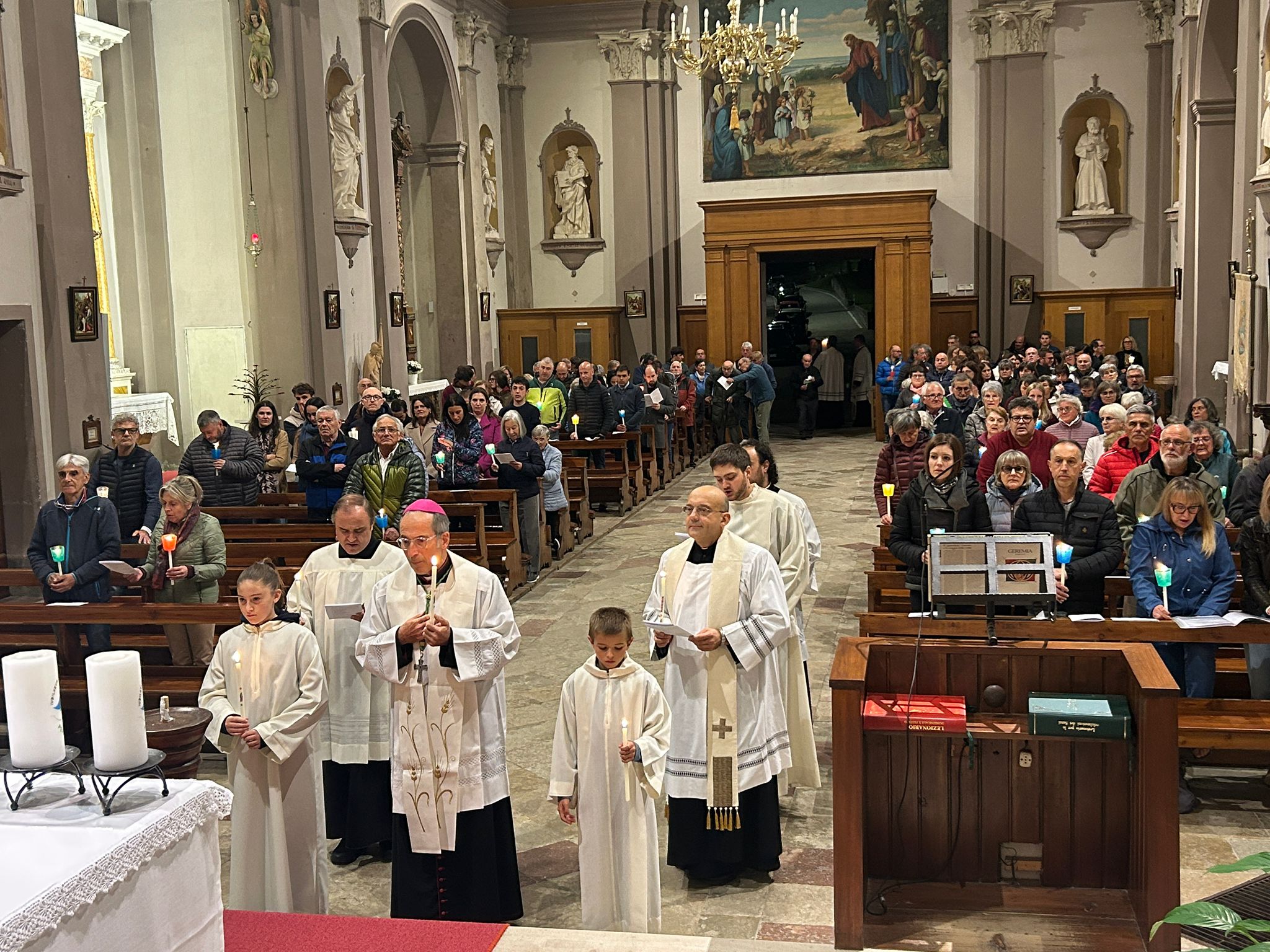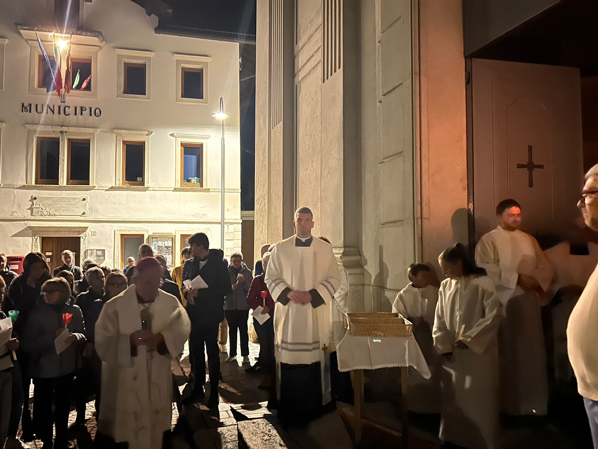 La veglia è iniziata all’esterno della chiesa di Rivamonte, con l’accensione delle candele al cero pasquale. È proseguita con la lettura del Vangelo del giorno. I nuovi parroci hanno asperso l’assemblea con l’acqua benedetta e incensato l’altare.