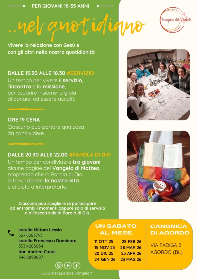A partire da sabato 11 ottobre inizierà in agordino il percorso “Nel quotidiano…” per giovani dai 18 ai 35 anni, promosso dalle sorelle Discepole del Vangelo, e in collaborazione con don Andrea Canal. Con la cadenza di un sabato al mese la proposta invita a vivere due momenti: un tempo di servizio nel corso del pomeriggio, dedicato all’incontro e alla missione, per scoprire insieme la … Continua a leggere Nel quotidiano