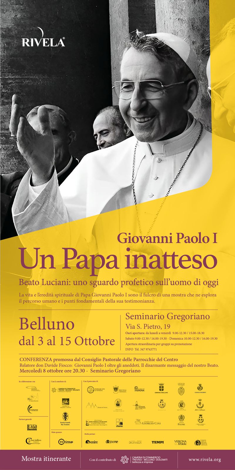 Dal 3 al 15 ottobre farà tappa a Belluno, presso lo stesso Seminario che lo vide alunno e formatore dal 1928 al 1958, la mostra itinerante “Un papa inatteso – Beato Luciani: uno sguardo profetico sull’uomo di oggi”. Si tratta di un percorso espositivo dedicato alla figura di Giovanni Paolo I, nel quadro del Giubileo della Speranza. Sarà aperta dal lunedì al venerdì (ore 9.00-12.30; 15.00-18.30); il sabato (ore 9.00-12.30; 16.00-19.30); la domenica (ore 10.00-12.30; 16.00-19.30); apertura straordinaria per gruppi su prenotazione (cell. 347 9743771).
