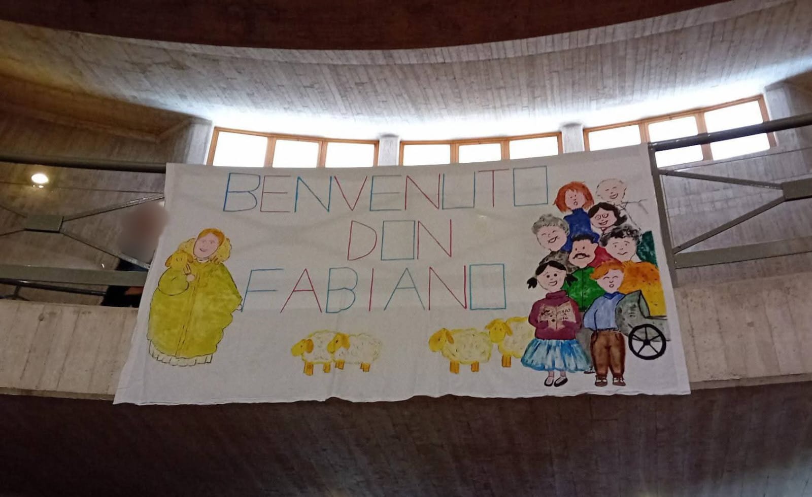 Una veglia serale semplice, ma molto partecipata: sotto a un colorato striscione di benvenuto, parrocchiani di tutte le età si sono riuniti per dare il loro abbraccio di benvenuto a questo giovane sacerdote.