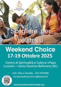 Si può essere più felici prendendo in mano la realizzazione della propria vita, diventando più responsabile dei comportamenti e rispondendo in modo sano ai propri bisogni? A scegliere veramente si impara. A queste questioni, tutt’altro che secondarie, la proposta del Weekend “Choice” (scegliere), che si svolgerà da venerdì 17 a domenica 19 ottobre presso il Centro di spiritualità “Papa Luciani” di Santa Giustina cerca di dare risposta. La proposta è rivolta in maniera particolare a giovani dai 20 ai 35 anni, periodo dell’esistenza caratterizzato da scelte che ne indirizzano, spesso in modo determinante, l’andamento futuro e si inserisce nello stile caratteristico del movimento “IM” (“Incontro matrimoniale”). Il carattere residenziale dell’evento, organizzato per la zona del Triveneto Ovest solo due volte l’anno, è poi garanzia di un tempo disteso di riflessione e di condivisione, propizio per lo scopo stesso della proposta.